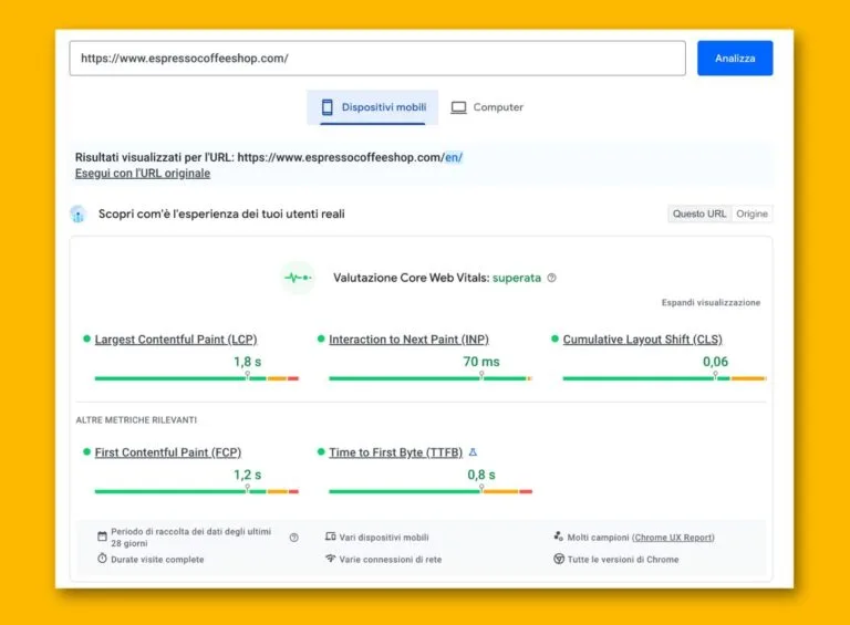 Abbiamo ottenuto risultati straordinari nelle valutazioni dei Web Core Vitals, sia su mobile che su desktop. I punteggi raggiunti sono stati tra i migliori mai registrati, garantendo un’esperienza utente rapida, fluida e ottimizzata.